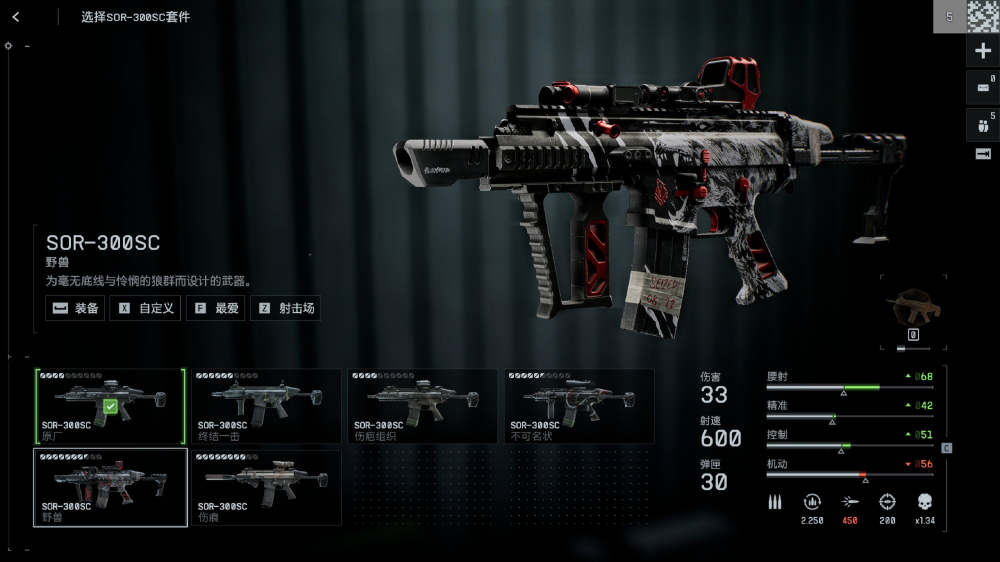 兩把新增武器中,卡賓槍新成員是以Scar為原型的SOR-30,面板數(shù)值相對(duì)在卡賓槍中屬于傷害較高的,目測(cè)在滿配的情況下,準(zhǔn)確度也不錯(cuò),只是目前卡賓槍的通病,傷害衰減較為明顯。