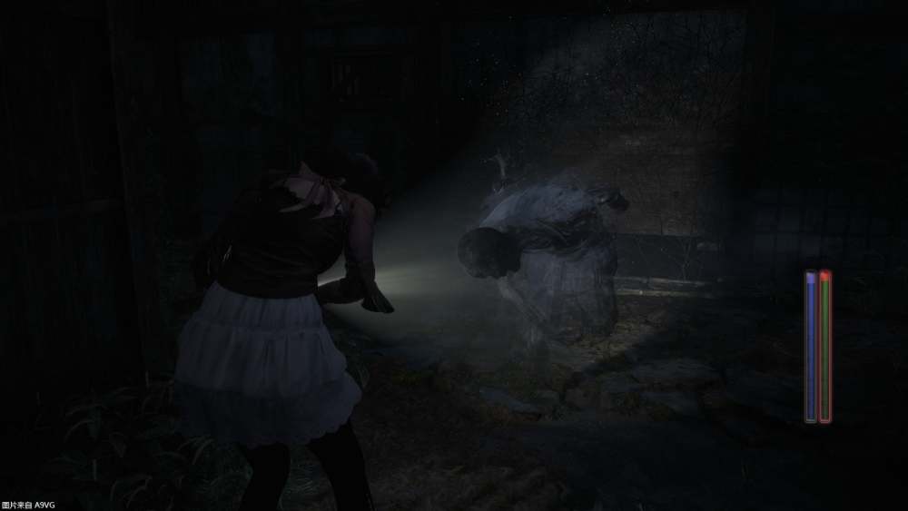 拉近鏡頭便能在怨靈不易察覺的情況下躲藏于遮蔽物后方,從遠(yuǎn)距離給予傷害。此外,也可透過拉遠(yuǎn)鏡頭來拍攝大范圍的景物。游戲中亦有必須透過縮放才能拍攝到的物體,本功能在探索時(shí)也能派上用場(chǎng)。