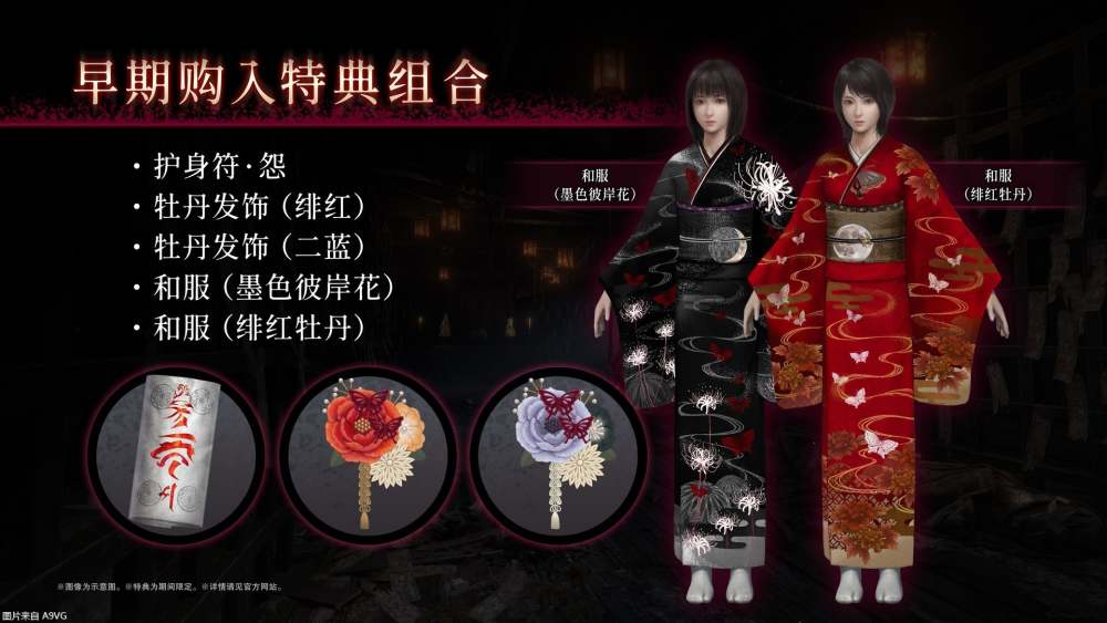 早期購入特典將附贈(zèng)「護(hù)身符?怨」、「牡丹發(fā)飾(緋紅/二藍(lán))」與「和服(墨色彼岸花/緋紅牡丹)」。實(shí)體版為首批特典,送完為止。下載版需于 3 月 25 日(三)前購買方可獲得。